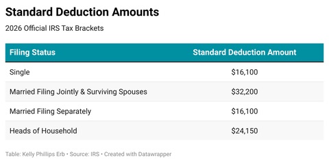 For 2026, the IRS has increased the standard deduction to: